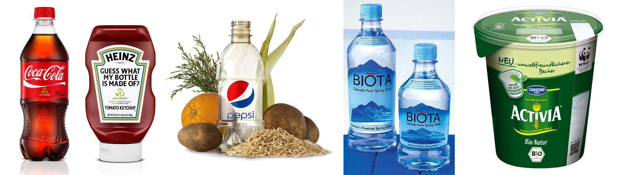 Инициаторы массового использования биопластиков — это почти всегда крупные производители продуктов питания или косметики. Вот несколько заметных проектов последних лет: французский Danone со стаканчиком для йогурта «Активия» из ПЛА (марка Ingeo от NatureWorks), компания Coca-Cola с бутылками из растительного аналога полиэтилентерефлата (ПЭТ) собственного производства, компания PepsiCo, также выпускающая растительный ПЭТ для своих бутылок. В бутылки из ПЛА марки Ingeo от NatureWorks заливают минеральную воду Biota и расфасовывают детские йогурты Stonyfield Farm. Большая компания RPC выпустила пробную серию косметической упаковки из ПГА.