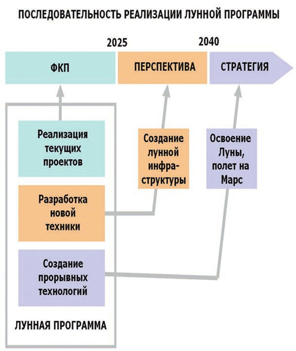 Выступая на V Международном симпозиуме по Солнечной системе, директор Института космических исследований РАН Лев Зелёный в своем докладе обрисовал три основных блока, которые включают лунные планы России. Первый блок предполагает реализацию проектов, утвержденных в рамках ФКП 2016–2025 годов, целью которых является достижение ближайших научных, технических и технологических целей лунной космонавтики. Второй блок должен обеспечивать создание новой техники для реализации будущих лунных проектов в период 2026–2040 годов. Наконец, третий блок направлен на создание новых прорывных технологий, которые в соответствии с текущим прогнозом будут необходимы для реализации космических проектов на Луне и в дальнем космосе уже после 2040 года.