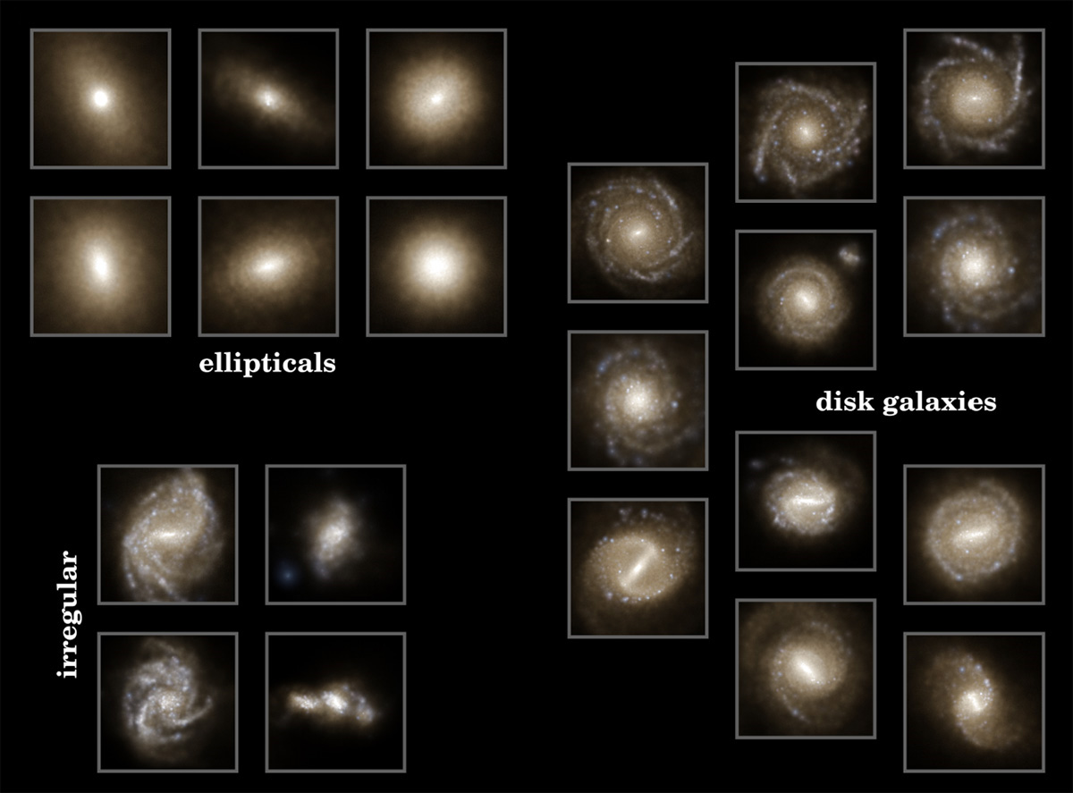 В еще более крупном масштабе движение галактик изучают с помощью численных моделей. В 2014 году был сделан шаг вперед с появлением результатов проекта Illustris. Изюминка в том, что космическая эволюция прослежена от самых от окраин и истоков до формирования отдельных галактик со всей их структурой. То есть прямо формируются галактики разных типов, и это можно сравнивать, например, с «хаббловскими» данными. Такие крупные проекты по моделированию формирования галактик крайне важны, так как их данные затем применяют самые разные исследовательские группы с разными полезными целями. Например, используя данные проекта EAGLE (1407.7040), Тил Савала (Till Sawala) и соавторы (1412.2748) смогли наконец-то разрешить все проблемы Местной группы галактик. Стало ясно, что и относительно небольшое число карликовых галактик, и их пространственное распределение (и кое-что еще) — вполне естественные свойства. А показано это было как раз на основе крупномасштабного моделирования, из которого выбирались пары галактик типа нашей и Андромеды, а потом смотрелось, что там вокруг них летает и как это должно наблюдаться.