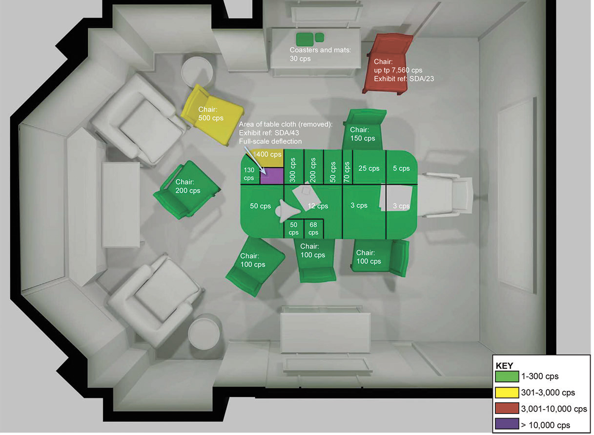 Распределение активности полония в офисе Тимоти Рейли компании Erinys int.<a name=b1></a><sup><a href=/nauchno-populyarnaya_biblioteka/432585#1>1</a></sup> (<a href=/"https://www.litvinenkoinquiry.org/wp-content/uploads/2015/02/INQ0179242.pdf" target=_blank>INQ017924</a>). Предполагаемая рассадка персонажей на совещании 16.10.2006 (<a href=/"https://www.litvinenkoinquiry.org/wp-content/uploads/2015/02/lit120215.pdf" target=_blank>Day 10</a>, стр. 85; <a href=/"https://www.litvinenkoinquiry.org/wp-content/uploads/2015/03/INQ018987.pdf" target=_blank>INQ018987</a>): во главе стола <i>слева</i> — А. Литвиненко, <i>справа</i> от него — Т. Рейли, <i>слева</i> от Литвиненко — А. Луговой (под руками — активность 143 тыс. Бк), <i>слева</i> от Лугового — Д. Ковтун (на всем красном стуле — 1 млн Бк; <a href=/"https://www.litvinenkoinquiry.org/wp-content/uploads/2015/03/lit040315.pdf" target=_blank>Day 20</a>, стр. 28)
