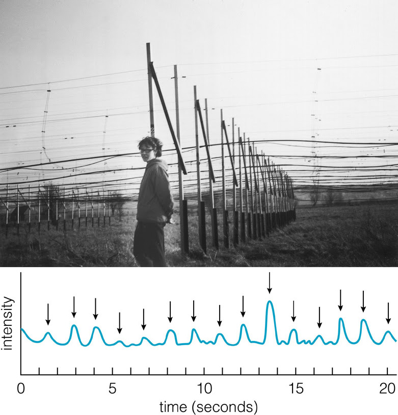 Джоселин Белл возле радиотелескопа, построенного своими руками. Внизу — «гребёнка» на бумажной ленте самописца — сигналы от пульсара. Из статьи Джоселин Белл (Annals New York Academy of Sciences, 1977)