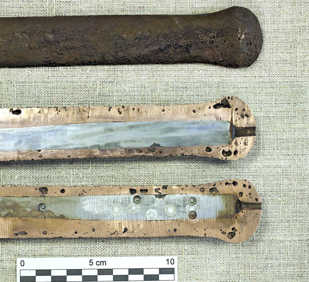 Исследование уникальных находок с использованием синхротронного излучения показало, что медь, покрывающая артефакт, была нанесена заливкой из расплава в отливочную форму, о чем свидетельствуют наплавы на внутренней стороне изделия. Пористая структура оболочки свидетельствует о фактически моментальном затвердевании меди в теле отливочного тигля. При этом внутренний стальной прут был зажат с торцов в отливочной форме между двух чугунных пластин.