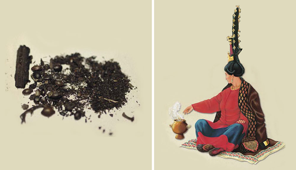 В медном котелке из 2-го пазырыкского кургана были обнаружены обугленные семена и веточки конопли — следы воскурений (слева). Государственный Эрмитаж. Справа — реконструкция Д. Позднякова (Новосибирск)