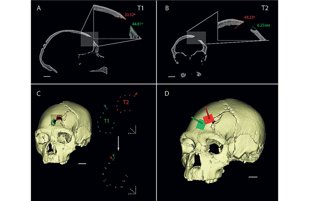 Два смертельных пролома черепа № 17: вверху — на данных компьютерной томографии, в продольном и поперечном разрезах; внизу — на восстановленной копии и на 3D-модели. Показан расчетный угол ударов, нанесенных убийцей сотни тысяч лет назад