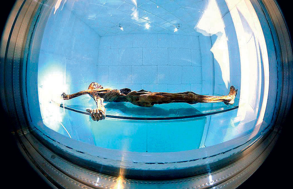 Тело было обнаружено ранней осенью 1991 года семейной парой из Германии, совершавшей поход по Эцтальским Альпам в швейцарском Тироле. Вмороженные в лед останки сохранились исключительно хорошо, и поначалу туристы посчитали, что имеют дело с преступлением недавнего времени. Они вызвали полицию, которая не слишком бережно извлекла труп. Однако вскоре почтенный возраст стал очевидным, и ученые точно датировали время преступления — 3300 лет назад.