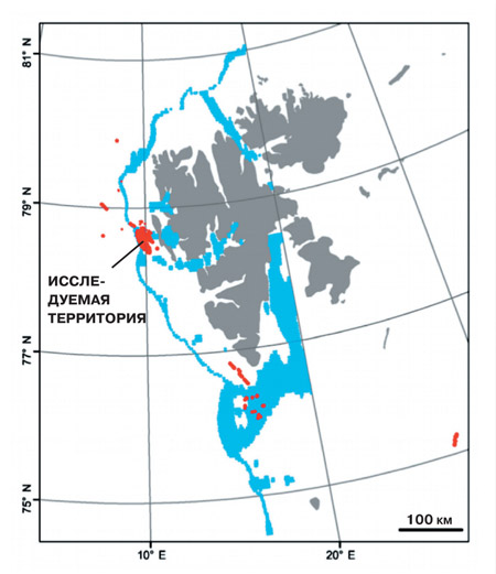 Карта Шпицбергена изображает положение предсказанных месторождений метаногидратов (синий цвет) и замеченных потоков метана со дна (красные точки). Рисунок: Myhre, C. L., et al. Extensive release of methane from Arctic seabed west of Svalbard during summer 2014 does not influence the atmosphere // Geophys. Res. Lett. 2016, 43, doi: 10.1002/2016GL068999