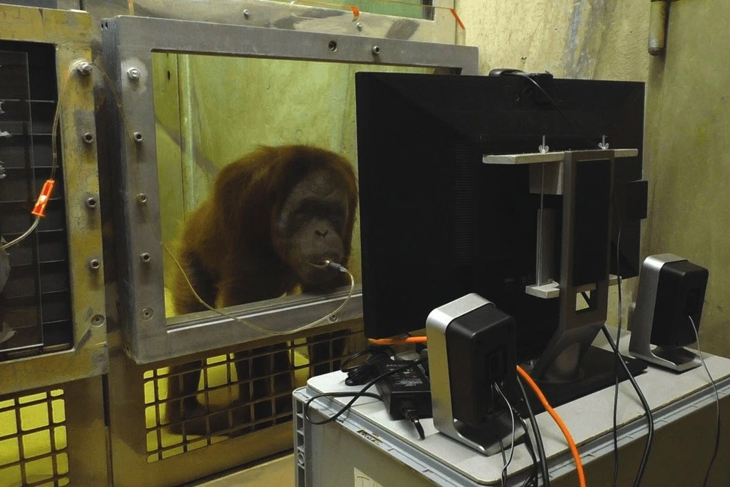 Ученые работали с обезьянами из Лейпцигского зоопарка в Германии и Святилища Кумамото в Японии: девятнадцатью шимпанзе Pan troglodytes, четырнадцатью бонобо P. paniscus и семью орангутанами Pongo abelii. Обезьянам показывали видео о конфликте человека и Кинг-Конга (КК), роль которого исполнял костюмированный актер (фото 2). В первом эксперименте человек пытался поймать КК, который прятался в одном из двух больших стогов. Когда человек уходил, КК убегал, затем человек возвращался с палкой и шел к центру площадки. В другом эксперименте человек искал камень, который КК у него отнял и спрятал под одной из двух коробок. После этого КК прогонял человека, перекладывал камень под другую коробку, а затем вообще уносил. Вернувшийся человек хотел достать камень. Для этого надо подтянуть к себе платформу с обеими коробками, взявшись за ручку, расположенную посередине. На этом видео заканчивалось. Во всех сюжетах человек, возвращаясь, двигался к центру площадки и смотрел прямо перед собой. Ни жестом, ни взглядом он не дал понять, какой из двух ящиков или стогов его интересует.