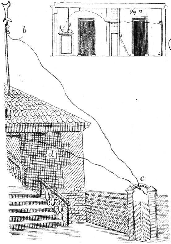 — ...в полной готовности к грозам. Внезапный громкий звон и яркие искры на лестнице так пугали жену Франклина, что она написала мужу письмо в Лондон с просьбой отключить своё электрогрозовое устройство.