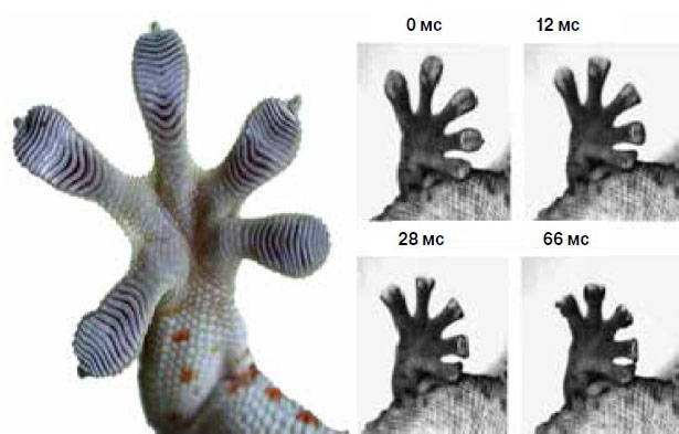 Оценки показывают, что для обеспечения нужной силы притяжения размер мельчайших структур у геккона должен быть уже около 20 нанометров. И такие структуры у него в самом деле существуют. Это не только ставит конкретную задачу перед нанотехнологами, но и дает надежду создать искусственные покрытия, способные держать на весу объекты из нашего макроскопического мира, включая самого человека. Все это сделало геккона одним из излюбленных объектов исследования последнего десятилетия. И в результате были созданы искусственные адгезионные покрытия, способные выдерживать человека, подобно «схватывающим перчаткам» героев Брюса Стерлинга (см. рисунок в начале статьи).