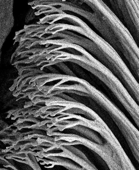 Куда перспективнее в плане создания практичных и универсальных адгезивов прямое использование сил Ван-дер-Ваальса. Тогда надо выяснить, как увеличить область контакта, то есть посмотреть, как это сделано в живой природе. Под микроскопом у животных, принадлежащих к самым разным видам, обнаруживаются качественно похожие структуры — ворсинки, заканчивающиеся небольшими пластиночками (рис. 2). Гибкие ворсинки могут пристраиваться к неровностям рельефа, компенсируя тем самым его неоднородности и увеличивая площадь реального контакта. Решение поразительно простое по идее и, похоже, на редкость универсальное.