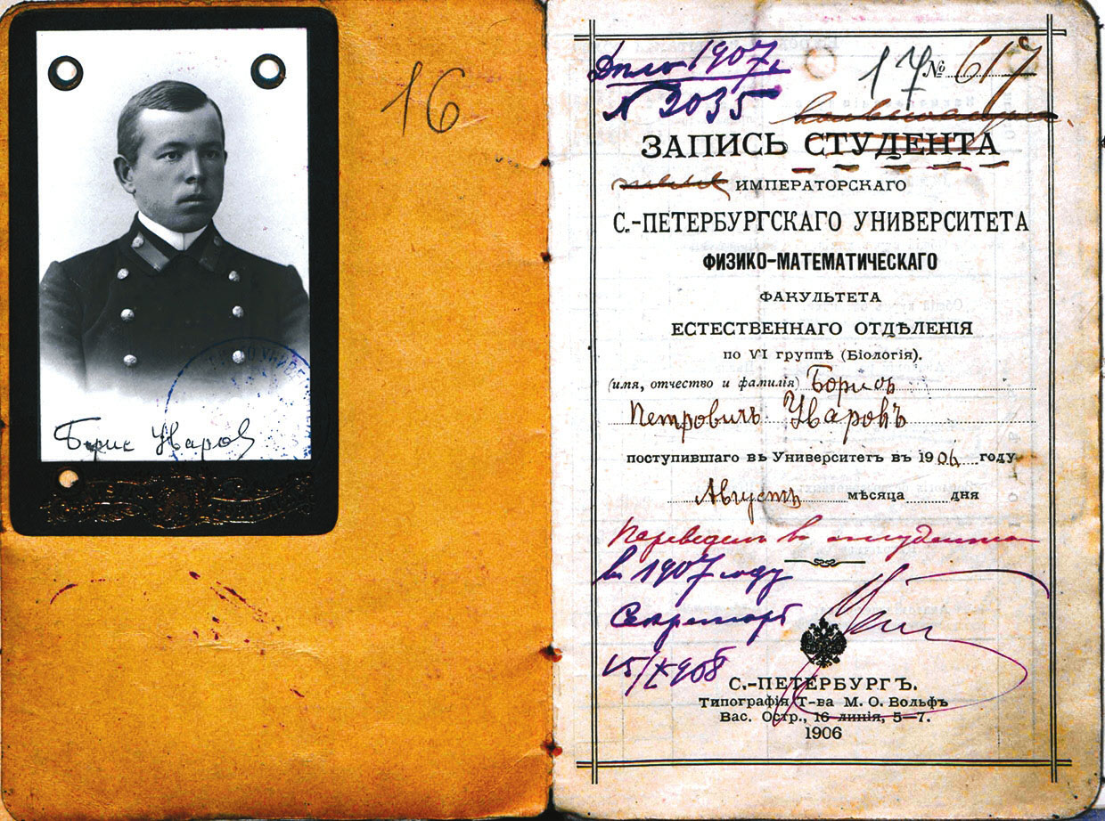 Титульная страница «Записи студента имп. Санкт-Петербургского университета физико-математического факультета естественного отделения по VI группе (биология) Бориса Уварова» (аналог зачетной книжки). Рукописные исправления показывают, что Уваров первоначально поступил в университет вольнослушателем, а весной 1907 года стал действительным студентом (ЦГИА. Ф. 14. Д. 50126. Л. 16об–17)