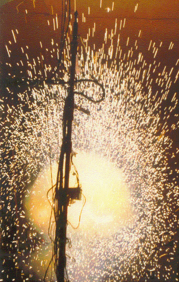Траектории движения двух шаровых молний, снятые на длинной выдержке: одна тихо погасла, а другая взорвалась. По соотношению диаметра траектории с диаметром пятна взрыва можно оценить плотность энергии, запасенной в шаровой молнии, — около 3 кДж/см3