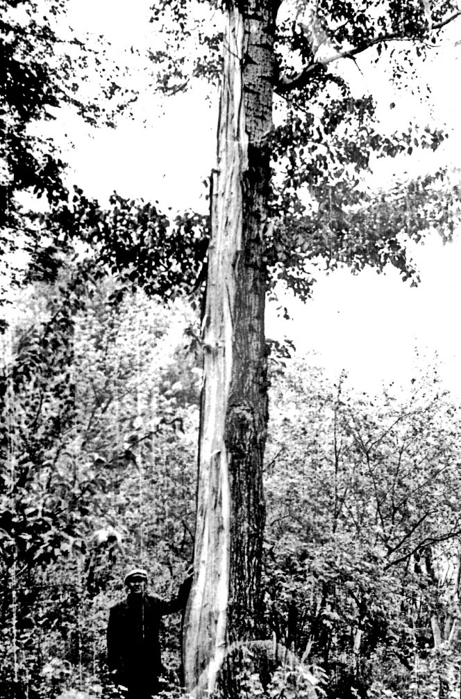 Тополь, которого на уровне верхнего края отщепа коснулась шаровая молния радиусом 25 см и со взрывом отщепила часть ствола. Куски дерева весом до 25 кг отбросило на расстояние до 30 м.