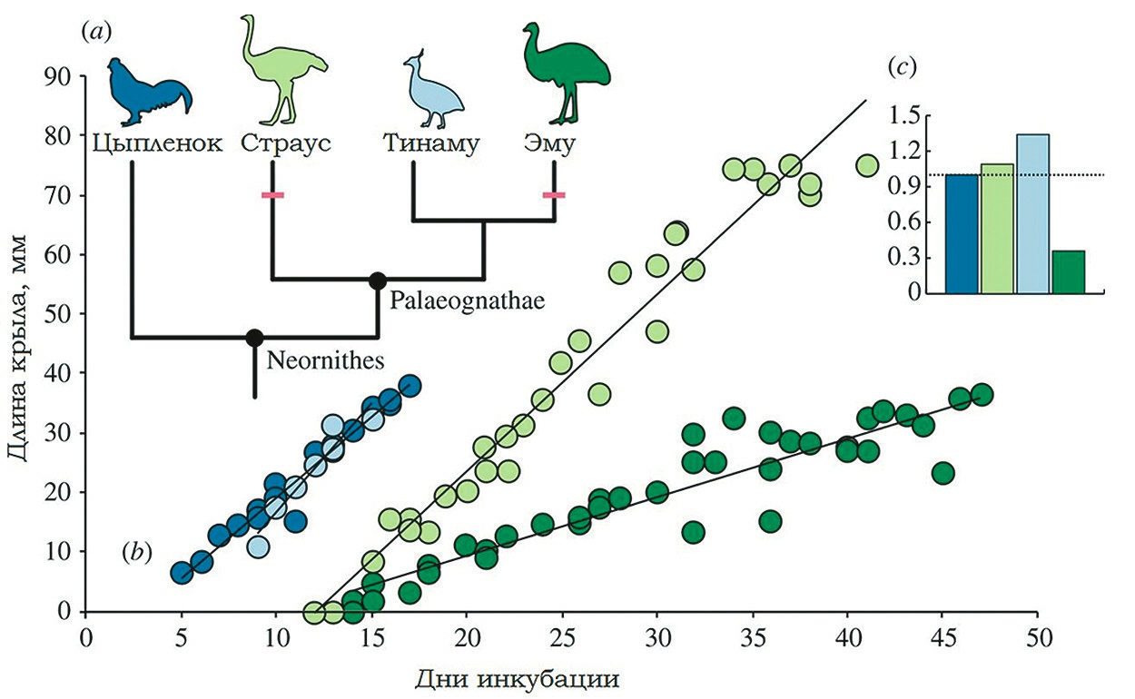Как и корпус, крылья у летающих птиц — кур и тинаму — растут примерно с одинаковой скоростью (рис. 2). Страус от них практически не отстает, а у эму скорость роста крыльев существенно ниже. Если принять скорость роста крыла эмбриона курицы за единицу, у страуса этот показатель будет на 9% выше, у тинаму — на 34% выше, а у эму — на 64% ниже (рис. 2). Абсолютный размер крыльев птенцов эму примерно такой же, как у птенцов тинаму и цыплят, но исключительно за счет долгого срока инкубации. Способность летать зависит не от абсолютной длины крыльев, а от их размеров относительно размеров туловища. Соотношение параметров туловища и крыльев у птенца тинаму примерно такое же, как у цыпленка (рис. 3). У эму туловище крупное, а крылья маленькие. Крылья африканского страуса, хотя и растут быстро, отстают от роста туловища и не могут его поднять.
