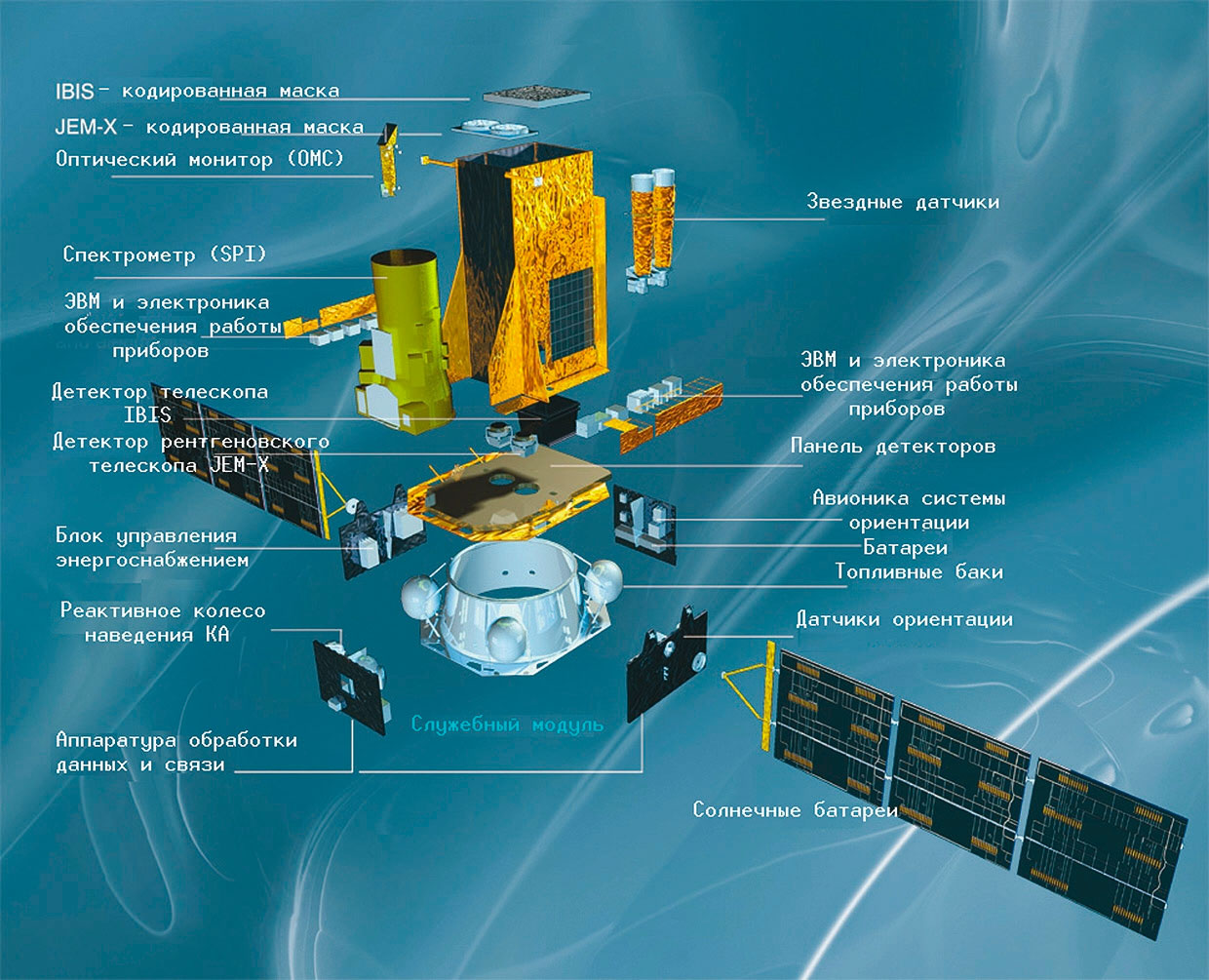 На обсерватории ИНТЕГРАЛ установлено четыре прибора. Как и основные приборы обсерватории «Гранат», они работают по принципу кодирующей апертуры (способ построения изображения без использования фокусирующих систем типа линз и зеркал. — Ред.). Это гамма-телескоп IBIS (Франция — Италия), германиевый спектрометр SPI (Франция — Германия) и вспомогательные мониторы для изучения объектов в рентгеновском (прибор JEM-X, Дания) и оптическом диапазонах (прибор OMC, Испания).