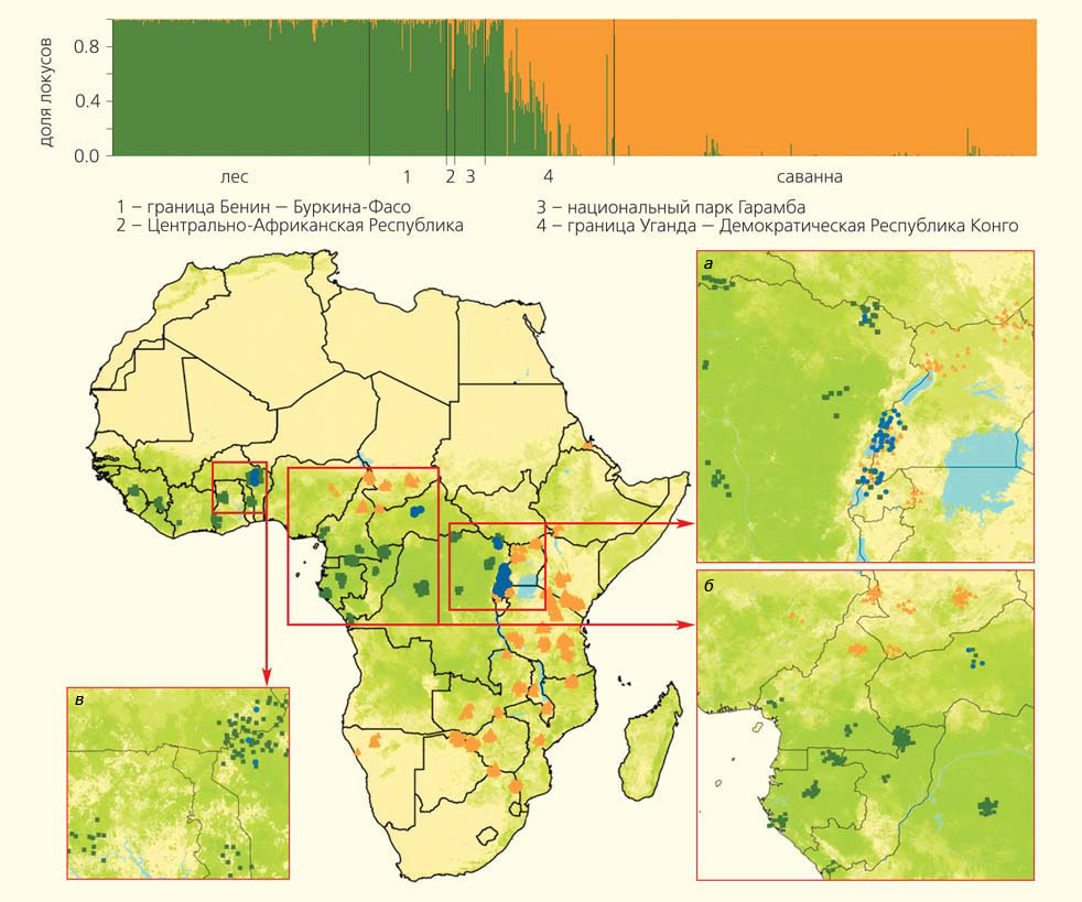Рис. 1. Гибридизация лесных и саванных слонов в зоне контакта [20]. Вверху — доля локусов лесного (зеленый цвет) и саванного (оранжевый) происхождения у лесных слонов, в четырех гибридных популяциях и у саванных слонов. Внизу — вероятное происхождение особей по данным генотипирования в Африке в целом, в области границы Уганды и Демократической Республики Конго (а), в Центрально-Африканской Республике (б) и в Западной Африке (в). Зеленые квадраты — лесные слоны, оранжевые треугольники — саванные слоны, синие кружки — гибриды