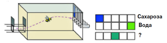 Рис. 2. Сладкая жизнь настраивает на оптимистический лад. Шмели привыкли, что слева под синей карточкой раствор сахарозы, а справа под зеленой — вода. Теперь им надо решить, стоит ли исследовать центральную пробирку