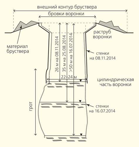 Исследования в начале сентября 2015 г. свидетельствовали о существенных изменениях размеров воронки, которая расширилась, приобретя цилиндрическую форму с почти вертикальными невысокими стенками. Внизу, на глубине 2–3,5 м, наблюдался пластовый лед (рис. 16).