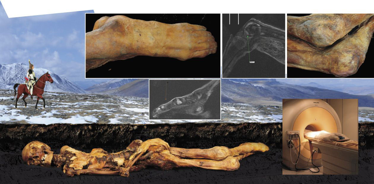 Данные, полученные с помощью посмертной магнитно-резонансной томографии мумии женщины из «замершего» пазырыкского погребения, свидетельствуют о выраженном действии на ее костный скелет и суставной аппарат жесткой функциональной нагрузки и неблагоприятных факторов (в основном травматического характера).