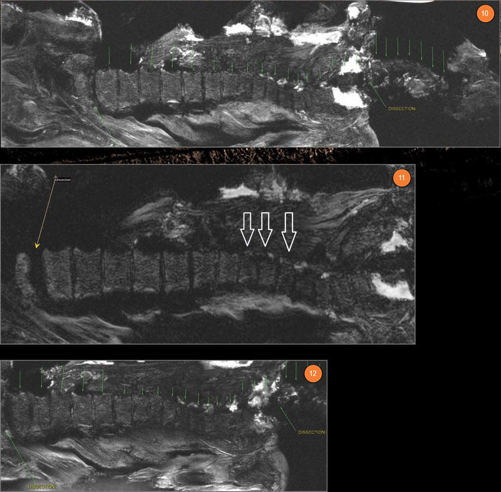 Рис. 10. Позвоночный столб мумии: в шейном отделе позвоночника 7 позвонков, в грудном — 12, а в поясничном — 5. Серия вертикальных зеленых стрелок показывает уровни по позвоночнику. Dissection — уровень артифициального рассечения на уровне шейно-грудного перехода. Сразу ниже него видны три грудных позвонка (Th1, 2, 3), деформированные и дающие сниженный МР-сигнал (по сравнению с нижележащими позвонками). Вокруг этих позвонков — отечные клетчаточные пространства (с высоким МР-сигналом). Второе рассечение без обозначения — на уровне крестцово-поясничного перехода (между крестцом и позвонком L5). Рис. 11. Компрессионные переломы тел позвонков Th8, 9, 10 (показаны полыми стрелками). Dissection — уровень артифициального рассечения на уровне крестцово-поясничного перехода (между крестцом и позвонком L5 — показано тонкой стрелкой). Рис. 12. Формирующиеся грыжи Шморля в телах позвонков Th8, 9, 10, 11, 12. Dissection — уровни артифициальных рассечений на уровне шейно-грудного и крестцово-поясничного переходов