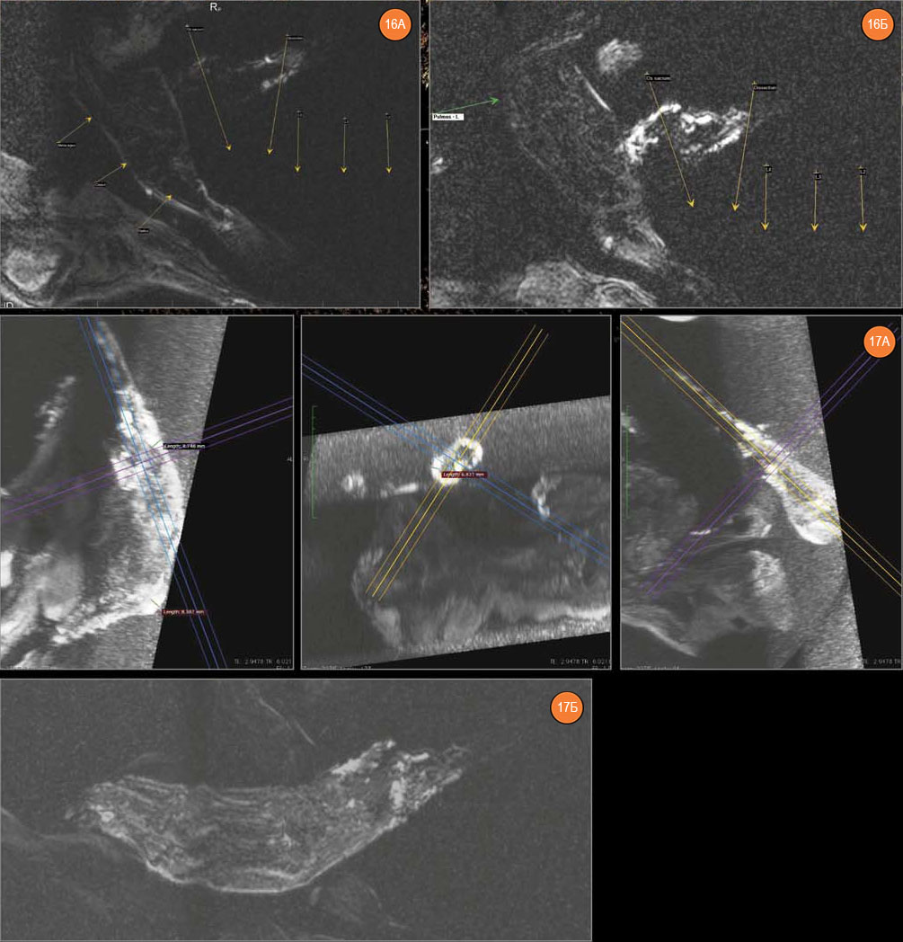 К сожалению, на полученных МР-томограммах невозможно было визуализировать все зубные ряды, хотя некоторые зубы верхней челюсти и их корни были видны: низкий сигнал от тканей зуба выделялся на фоне более высокого сигнала в альвеолярном отростке в челюсти.