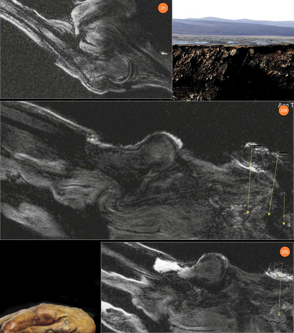 Кроме того, результаты МР-томографии указывают на наличие достаточно тяжелых патологических изменений. Они свидетельствуют в пользу продолжения исследования тканей мумии в патоморфологическом аспекте на предмет верификации природы костных очагов, состояния правой молочной железы и оставшихся клетчаточных пространств, а также для поиска лимфоузлов, пораженных метастатическим процессом. На основании подобных находок можно будет с высокой долей вероятности утверждать, что женщина страдала от онкологического заболевания, развившегося на фоне поражения правой молочной железы. Второй возможной хронической прижизненной патологией мог быть септический процесс, остеомиелитические проявления которого были найдены на МР-томограммах. Тяжелая травма с поражением мозгового черепа и суставов могла быть «последней каплей, переполнившей чашу», и стать непосредственной причиной смерти.