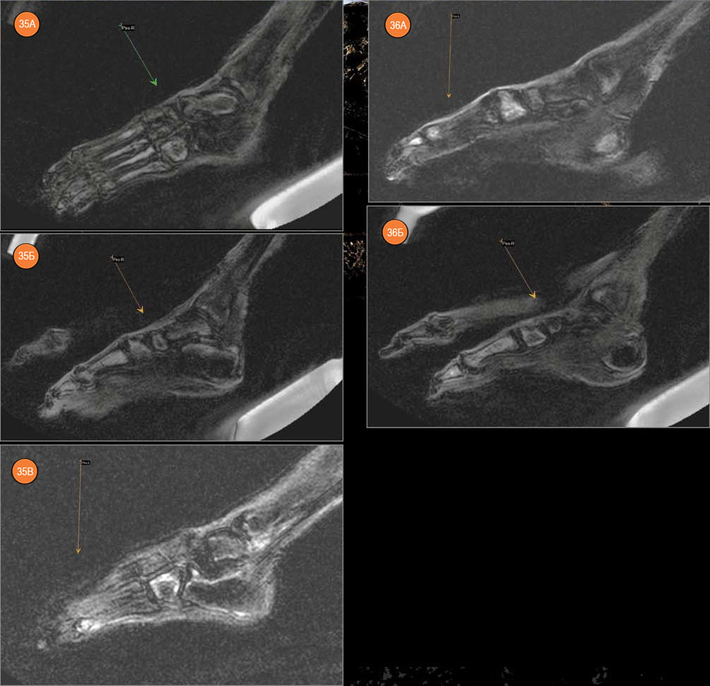 В костях левой стопы выявлены очаги с отечной периферией и с МР-плотными темными центральными зонами. Эти изменения можно интерпретировать как проявления прижизненного инфекционного или, что более вероятно, метастатического процесса. Аналогичные, но менее интенсивные очаги выявлены в костях правой стопы.