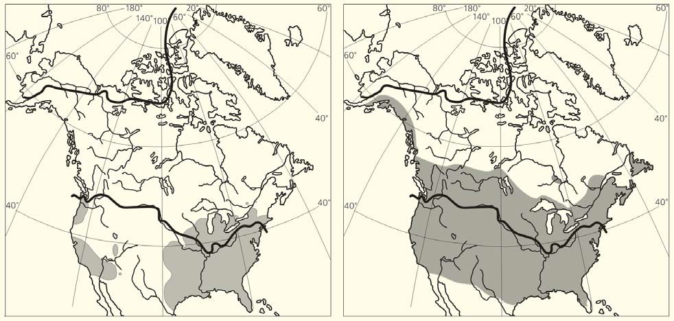 Распространение аборигенных (слева) и «экзотических» для Северной Америки (завезенных) дождевых червей ([3] с изменениями). Жирные линии — южная и северная границы ледника во время последнего ледникового максимума