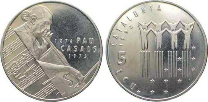 Рис. 3. Каталония, 5 экю 1993 года с портретом Пабло Казальса, медно-никелевый сплав