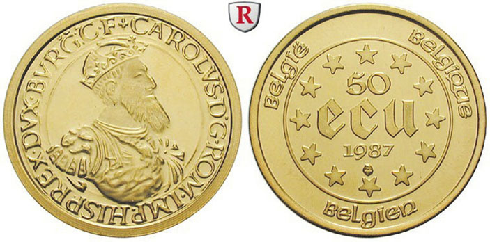 Однако в ряде стран монеты экю были некоторое время законным платежным средством! Так, например, в Бельгии в 1987 году поспешили отчеканить серебряные и золотые монеты номиналом 5 и 50 экю, посвященные 30-летию Римского договора. На них изображен император Карл V (рис. 5).