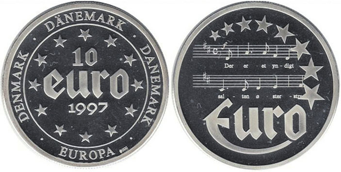 Рис. 9. Серебряная датская монета со словами и нотами начала гимна Дании