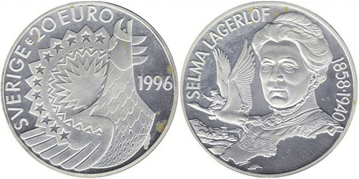 Рис. 10. Шведская серебряная монета 5 евро с портретом нобелевского лауреата писательницы Сельмы Лагерлёф