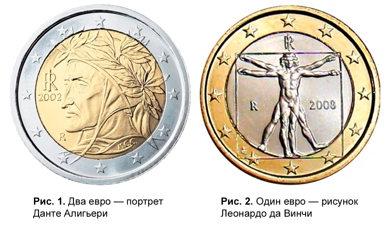 Один евро — знаменитый рисунок Леонардо да Винчи в галерее Академии в Венеции. Рисунок изображает пропорции человеческого тела
