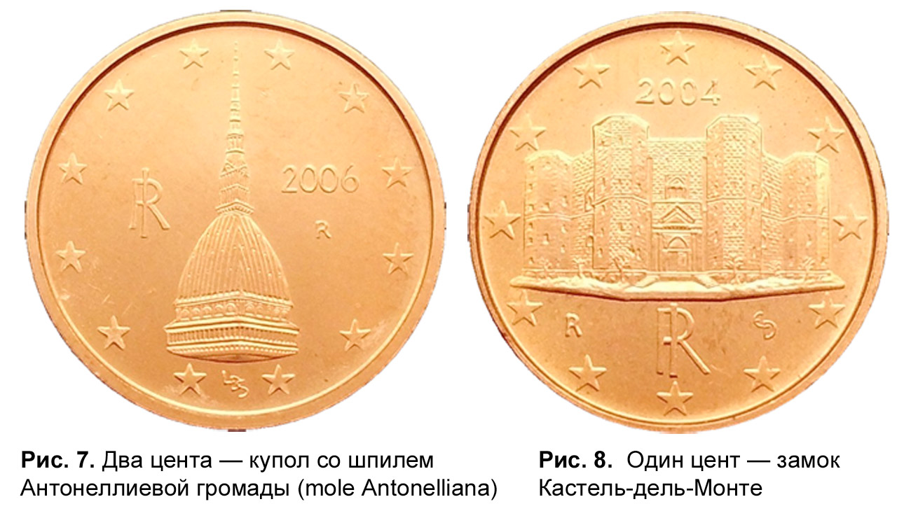 Два цента — купол со шпилем Антонеллиевой громады (mole Antonelliana). Этот символ Турина до 2011 года оставался самой высокой конструкцией в Италии (167,5 м). Здание спроектировано архитектором Алессандро Антонелли (1798–1888) в 1863 году по заказу еврейской общины как городская синагога. В последующие годы было выкуплено и достроено муниципалитетом Турина для Музея Рисорджименто, реставрировалось в 1961 году после смерча (сейчас там находится Национальный музей кинематографии)