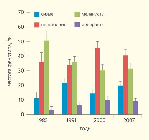 Существенное снижение доли меланистов в целом по Москве произошло в 1991 г. — с 50,4 до 36,1%, и в это же время значительно повысилась частота встречаемости сизых особей в ответ на уменьшение пресса меланизации (рис. 6).