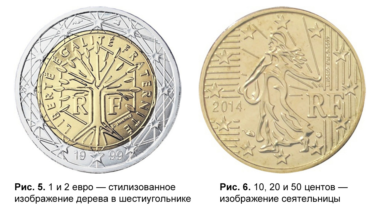 На аверсе каждой французской евромонеты имеется аббревиатура RF — République Française (Французская Республика). На самых крупных монетах, 1 и 2 евро, — стилизованное изображение дерева в шестиугольнике: Франция на карте напоминает шестиугольник (рис. 5). А дерево — это символ жизни, смены поколений и роста. На монете также начертан девиз Французской Республики: Liberté, Égalité, Fraternité («Свобода, Равенство, Братство»).
