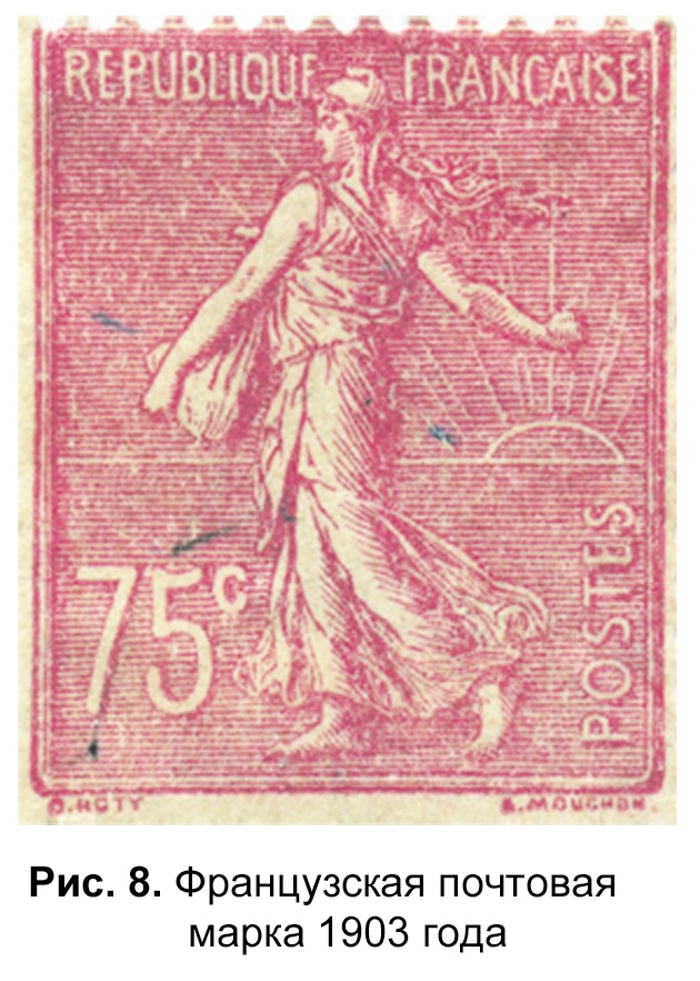 Впервые девушку-сеятельницу во фригийском колпаке изобразил в 1896 году молодой график и скульптор Луи Оскар Роти (его фамилия была помещена в нижней части рисунка и осталась на монетах). Рисунок Роти неоднократно побеждал в различных конкурсах. В 1897 году он впервые появился на французской монете 50 сантимов, а в 1903 году — на французских почтовых марках (рис. 8).
