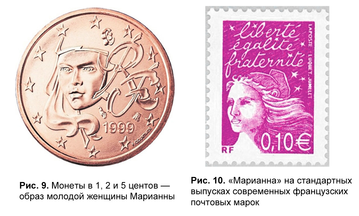На монетках в 1, 2 и 5 центов — образ молодой женщины, которую французы называют Марианной (рис. 9).