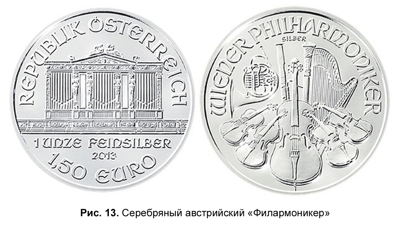 Отдельные темы — монеты стран, присоединившихся к зоне евро после 2002 года, а также огромное множество юбилейных и памятных евромонет. Последние имеют только крупные номиналы (от 2 евро и выше) и их часто чеканят из драгоценных металлов (в австрийских монетах номиналом 25 евро центральная вставка изготовлена из ниобия (см. статью «Монетные металлы: ниобий и тантал» [1]). Тиражи таких монет малы, в обращении они не поступают, а стоят, конечно, намного дороже номинала. Некоторые монеты (например, серебряный австрийский «Филармоникер») чеканятся большими тиражами и продаются банками многих стран в качестве инвестиционных монет (рис. 13).