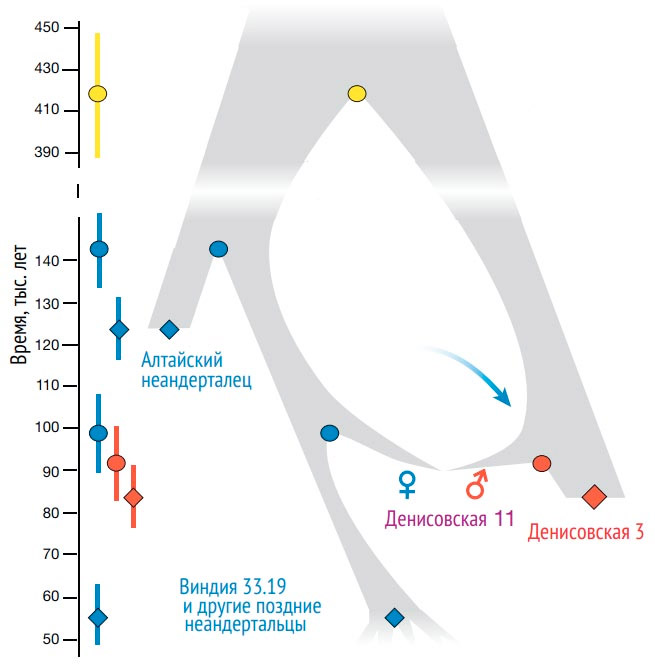 Если еще учесть, что денисовцы скрещивались с каким-то гоминином, отделившимся от нашей ветви более миллиона лет назад (и получили от него свои митохондрии), в геномах африканских пигмеев найдены фрагменты непонятного происхождения, а человек, живший в пещере Сима-де-Лос-Уэсос в Испании примерно 400 тыс. лет назад, по ядерному геному был ближе к неандертальцам, а по митохондриальному — к денисовцам, картина становится совсем сложной. Но уже ясно, что в двух из дюжины изученных древних геномов мы видим следы совсем недавних скрещиваний, и это доказывает, что такие скрещивания между представителями трех ветвей человека происходили часто. Почему же тогда эти ветви не слились? Похоже, что потомки от таких браков были менее жизнеспособны; в частности, сыновья от браков неандертальцев и кроманьонцев, видимо, были бесплодны.