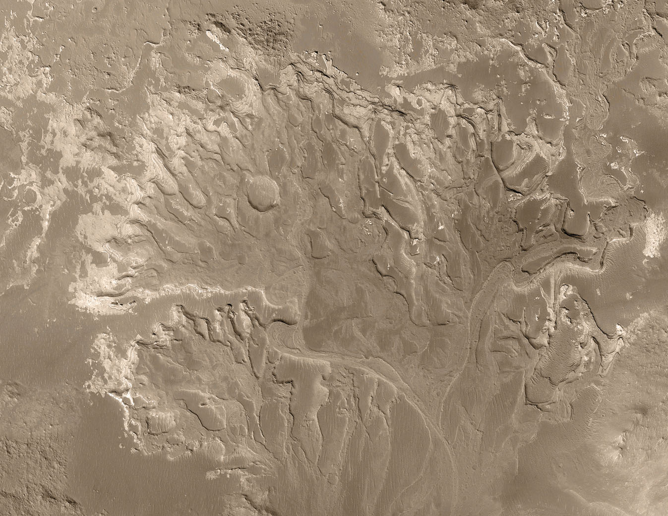 Русло высохшей марсианской реки. Пока текла река, вдоль русла накопились отложения, более плотные, чем окружающий грунт; когда вода высохла, окружающие породы постепенно разрушились ветром, а плотные отложения вдоль русла остались. Фото: en.wikipedia.org