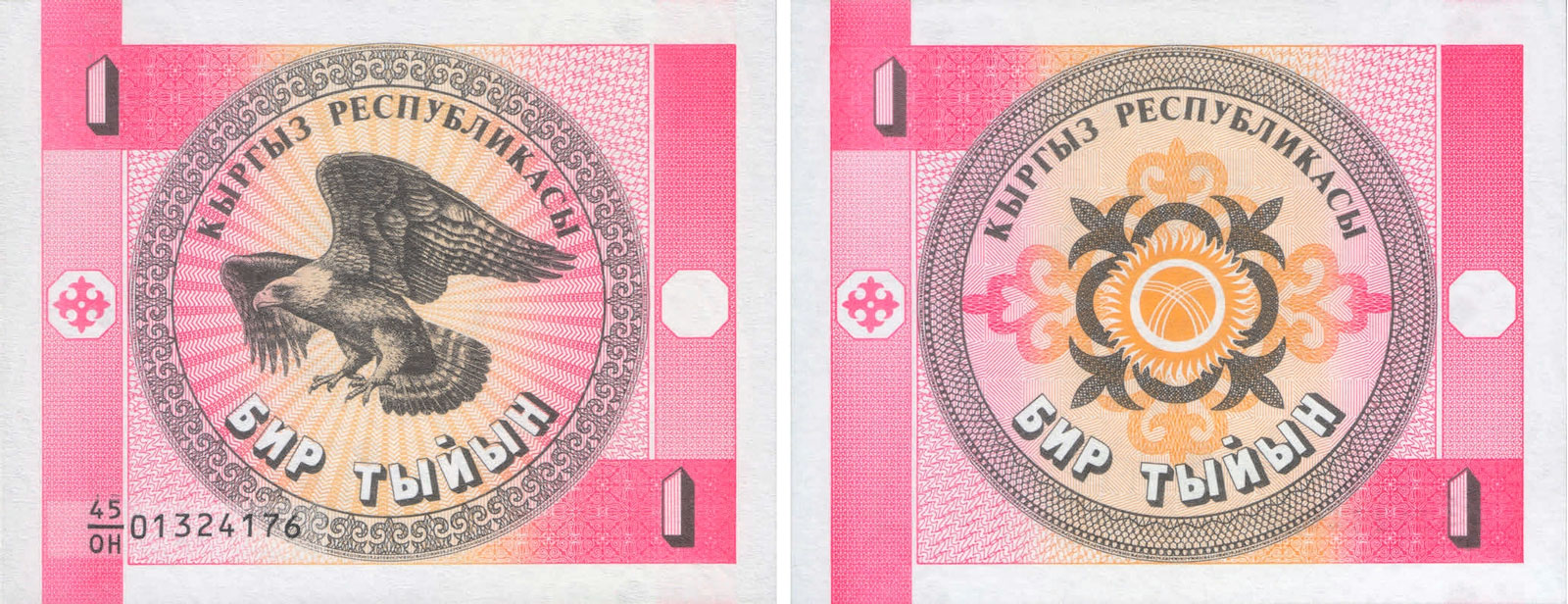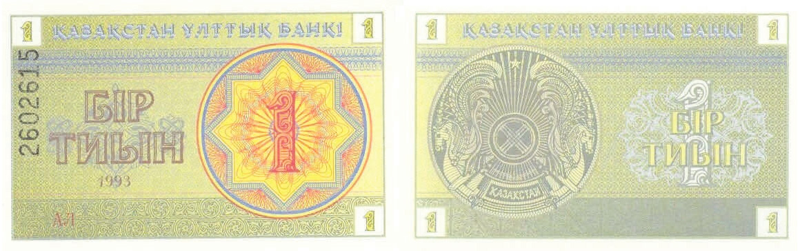 Теперь посмотрим на банкноты. Как и следовало ожидать, здесь разброс и разнообразие гораздо больше. Минимальный наблюденный номинал 0,01¢; как правило, такие номиналы печатали в самом начале выпуска совершенно новой валюты в очень простом рисунке и быстро выводили из обращения — так было, скажем, в Казахстане (рис. 10) и Киргизии (рис. 11).