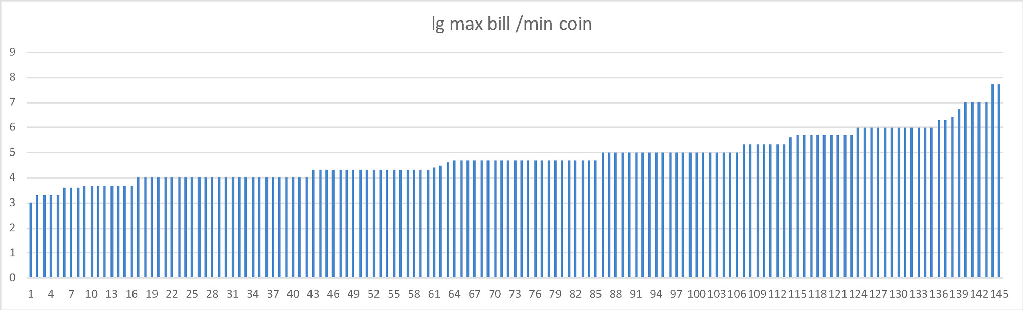Максимальный номинал в современных, по нашему критерию, системах — 5 млн донгов (Вьетнам; рис. 12); впрочем, еще недавно встречались и более грандиозные банкноты, скажем, 100 трлн зимбабвийских долл. (рис. 13), а в истории инфляции известны послевоенные венгерские банкноты 1 000 000 000 билпе́нгё (рис. 14; 1 билпенгё = 1 000 000 милпенгё = 1 000 000 000 000 пенгё). Как и в случае монет, наблюдаемое разнообразие минимальных номиналов меньше, чем максимальных (рис. 15). Разброс номиналов внутри одной системы варьирует от чуть более одного порядка (3 и 50 долл. Островов Кука) до семи порядков во Вьетнаме (рис. 16). Разброс для 100 стран укладывается между двумя и четырьмя порядками, что также шире, чем для монет.