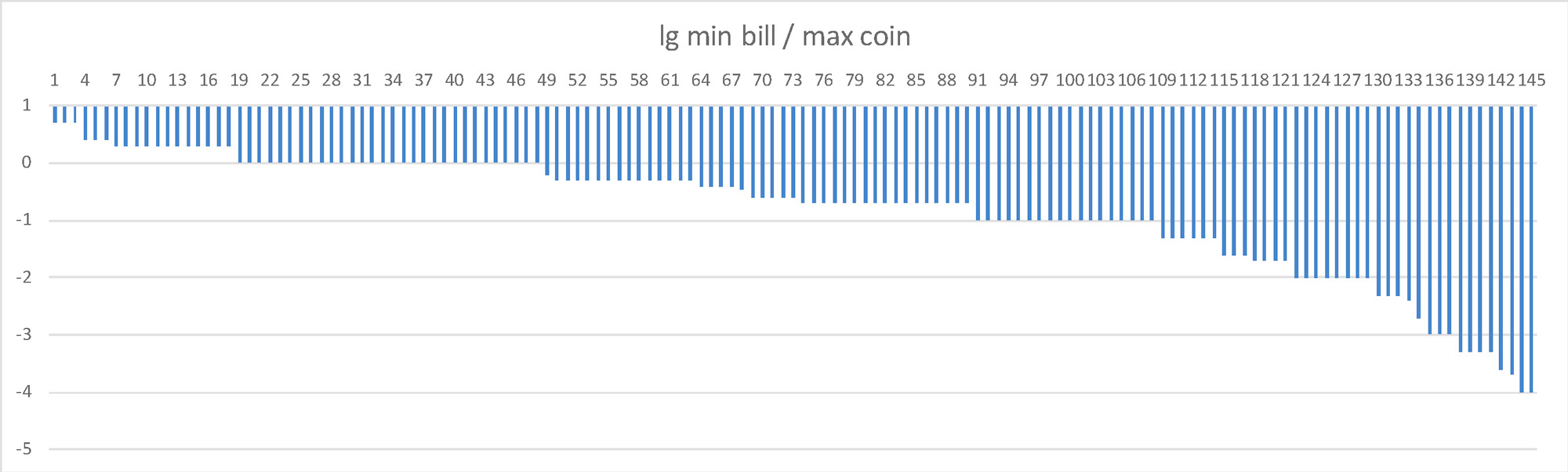 Второй вопрос: пересекаются ли интервалы монетных и бумажных номиналов (рис. 22)? Обычно, да, однако в восемнадцати странах максимальный номинал монеты был меньше минимального номинала банкноты, в трех случаях (в Сомали, Либерии и в системе Восточно-Карибского доллара) с максимальным различием в пять раз: максимальный номинал монеты 1$, а минимальный банкноты — 5$. В тридцати странах эти номиналы совпадали. Максимальное пересечение интервалов, в Казахстане и Вьетнаме, составило четыре порядка.