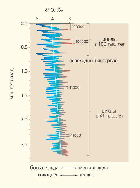 В 50–60-е годы прошлого столетия американский и английский исследователи Ч. Эмилиани (1922–1995) и Н. Шеклтон (1937–2006) установили, что в восстановлении реалий ледниковой эпохи весьма существенную помощь ученым могут оказать два важнейших параметра донных океанских отложений. Во-первых, это чередование грубых и тонких слоев в осадках, опускавшихся на морское дно с таявших на теплой поверхности моря айсбергов. Во-вторых — изменения количества вторичного изотопа кислорода 18О, содержащегося в оболочках морских раковинных одноклеточных фораминифер. Ученые пришли к заключению, что изотоп 18О может служить достаточно надежным материалом для дешифровки климата отдаленных эпох. Его концентрации отражают температурные изменения в различных морских слоях, и это напрямую связано с ледниковой ситуацией в конкретном ареале в определенное время. Устойчивый характер и строгая стратиграфическая последовательность глубинных донных морских напластований позволяла надеяться на увлекательную перспективу выявления истории ледников на очень широких пространствах.