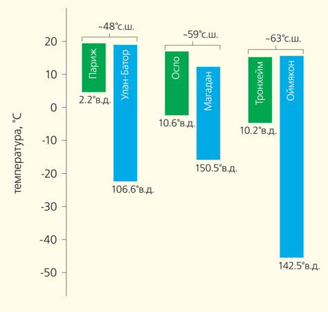 Диаграмма сопоставления климатических (температурных) характеристик отдельных пунктов на Западе и Востоке Евразии. Верхняя часть каждого столбика соответствует средней температуре июля, нижняя — средней температуре января