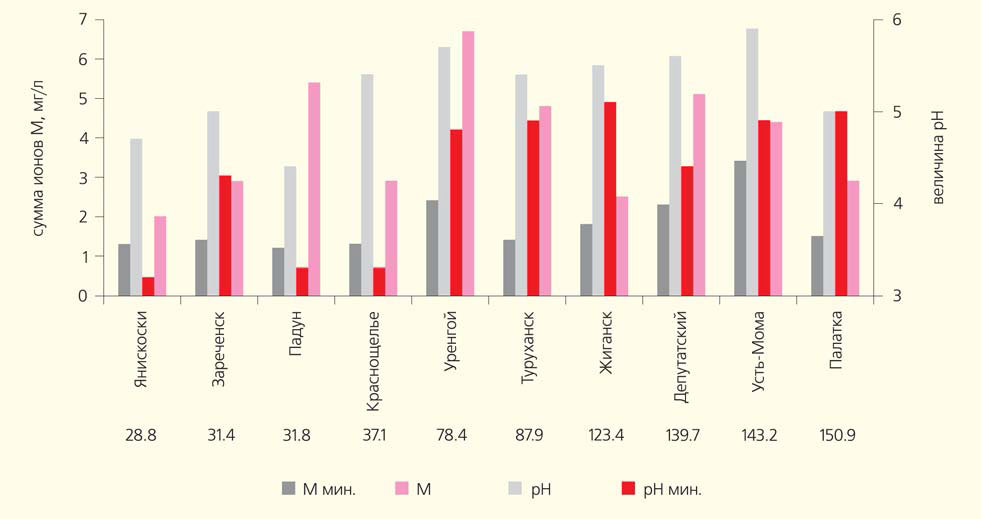Скорее гипотетический интерес представляют результаты наблюдений за распределением и ходом по восточной долготе абсолютно максимальной кислотности и минимальной минерализации осадков в Заполярье (рис. 4). Влажные выпадения с низкой суммой ионов, равной минерализации дистиллированной воды, имеют величину рН либо близкую к равновесной с углекислым газом воздуха, либо повышенную до значения рН ≈ 3,2. Избыток в осадках гидроксония (ионов водорода) компенсируется преимущественно сульфатами и нитратами и скорее всего не оказывает никакого влияния на природную среду ввиду низкой буферной емкости растворов. Очевидно различие этих величин по регионам европейской и азиатской частей страны: в большинстве случаев максимальная кислотность и минимальная сумма ионов наблюдаются на европейских станциях. Явление это — высокая кислотность при низкой минерализации осадков — отмечается только на заполярных станциях.