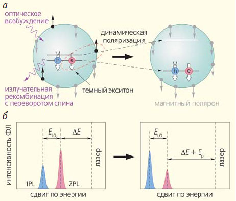 Рис. 4. Формирование магнитного полярона на поверхностных спинах и его оптическое детектирование. Динамическая поляризация спинов на поверхности нанокристалла в процессе оптического возбуждения и излучательной рекомбинации темного экситона с одновременным переворотом спинов электрона и оборванной связи (а). Модификация спектра ФЛ при резонансном возбуждении в результате формирования полярона (б)