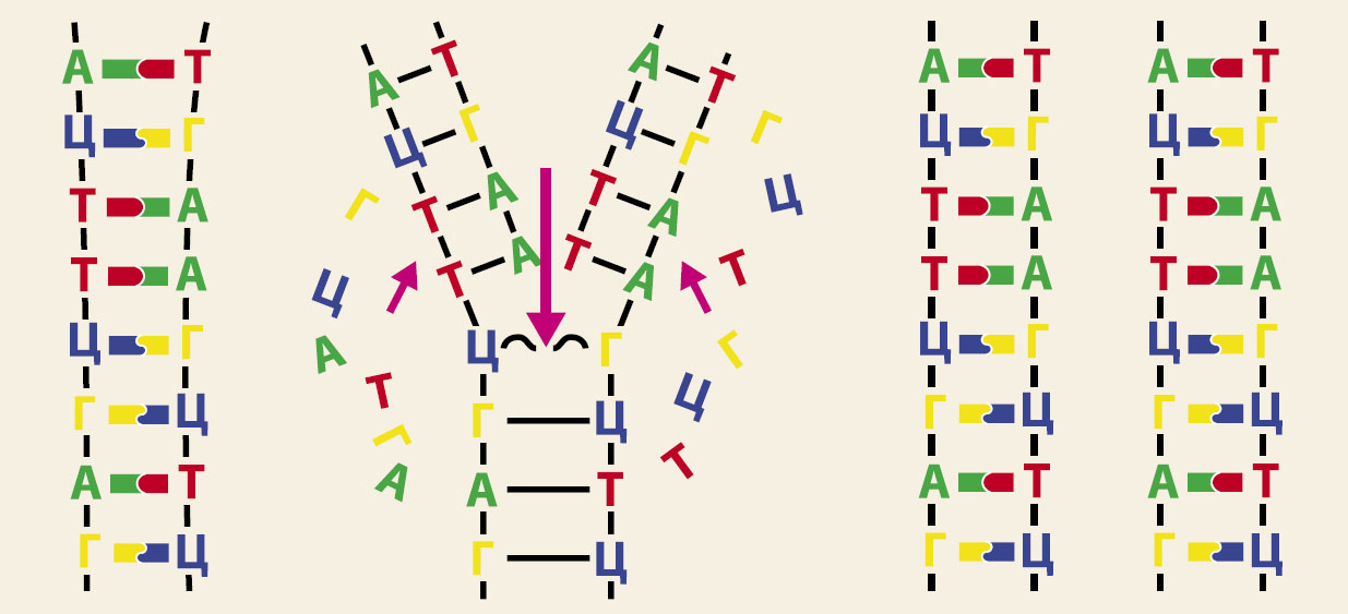 При этом в каждую молекулу ДНК входит не одна, а две нити, но одна из них полностью определяет другую: напротив Г в одной цепочке всегда стоит Ц в другой (и наоборот), а напротив А стоит Т (и наоборот). Это нужно для того, чтобы при делении клетки можно было легко получить точную копию любой молекулы ДНК: она разделяется на две нити, и на каждой однозначным образом достраивается вторая (рис. 1).