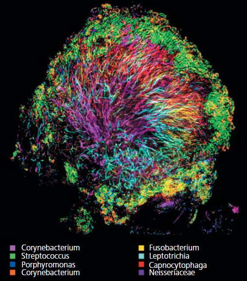 В полости рта взрослого человека обитает от 50 до 100 млрд бактерий около 96% видов от общего числа оральных бактерий, которые относятся к шести условным типам — Firmicutes, Actinobacteria, Proteobacteria, Fusobacteria, Bacteroidetes и Spirocheetes [5]. С этими, казалось бы, незаметными обитателями связано состояние здоровья нашего организма: они влияют на многие протекающие в нем процессы — от метаболизма до иммунных реакций. Микробиом полости рта не только уникален, но и легкодоступен: ротовая полость служит воротами, через которые микроорганизмы проникают внутрь и находят подходящее место для колонизации в пищеварительном тракте и дыхательных путях. Существует обширная литература, описывающая роль орального микробиома в жизни здорового человека и при развитии различных патологий (диабета, бактериемии, эндокардита, преждевременных родов, онкологических, аутоиммунных и других заболеваний). Американские микробиологи выпустили специальное руководство, в котором собраны все сведения о микробиоме полости рта [6]. Давно известно, что бактерии ротовой полости очень привередливы к тому, где и с кем им жить: выбирая соседей или место колонизации, они связываются с помощью своих адгезинов с рецепторами, расположенными на других бактериях или эпителиальных клетках. Таким образом, они не случайно накапливаются на поверхности зубов, языка или десен, а в результате специфического взаимодействия с ними. Несколько лет назад была разработана технология, которая позволяет визуализировать in situ пространственную организацию (биогеографию) бактериальных таксонов определенного микробиоценоза на основе известной информации о функциональных признаках конкретных его членов (рис. 3).